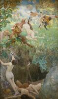 Gili Roig va escollir una interpretació al•legòrica. Sota el títol d’Abisme l’artista construí el que podríem denominar una paràbola sobre les conseqüències de la luxúria i la vida frívola, construïda a partir de la representació d'una escena de caire mitològic on unes nimfes són seduïdes per sàtirs, temptades amb tresors, i arrossegades en una profunda i abismal rasa. Aquests sàtirs reben l’ajuda de Canídia, una dona embruixada que impedeix que les nimfes puguin sortir del seu captiveri. La resolució formal de l’obra apuntava a un dels aspectes més significatius en aquells anys de la producció pictòrica de Gili i Roig, l’al•legoria simbolista com una variant temàtica, que no formal, de l’eclecticisme que caracteritzava el global de la seva obra.