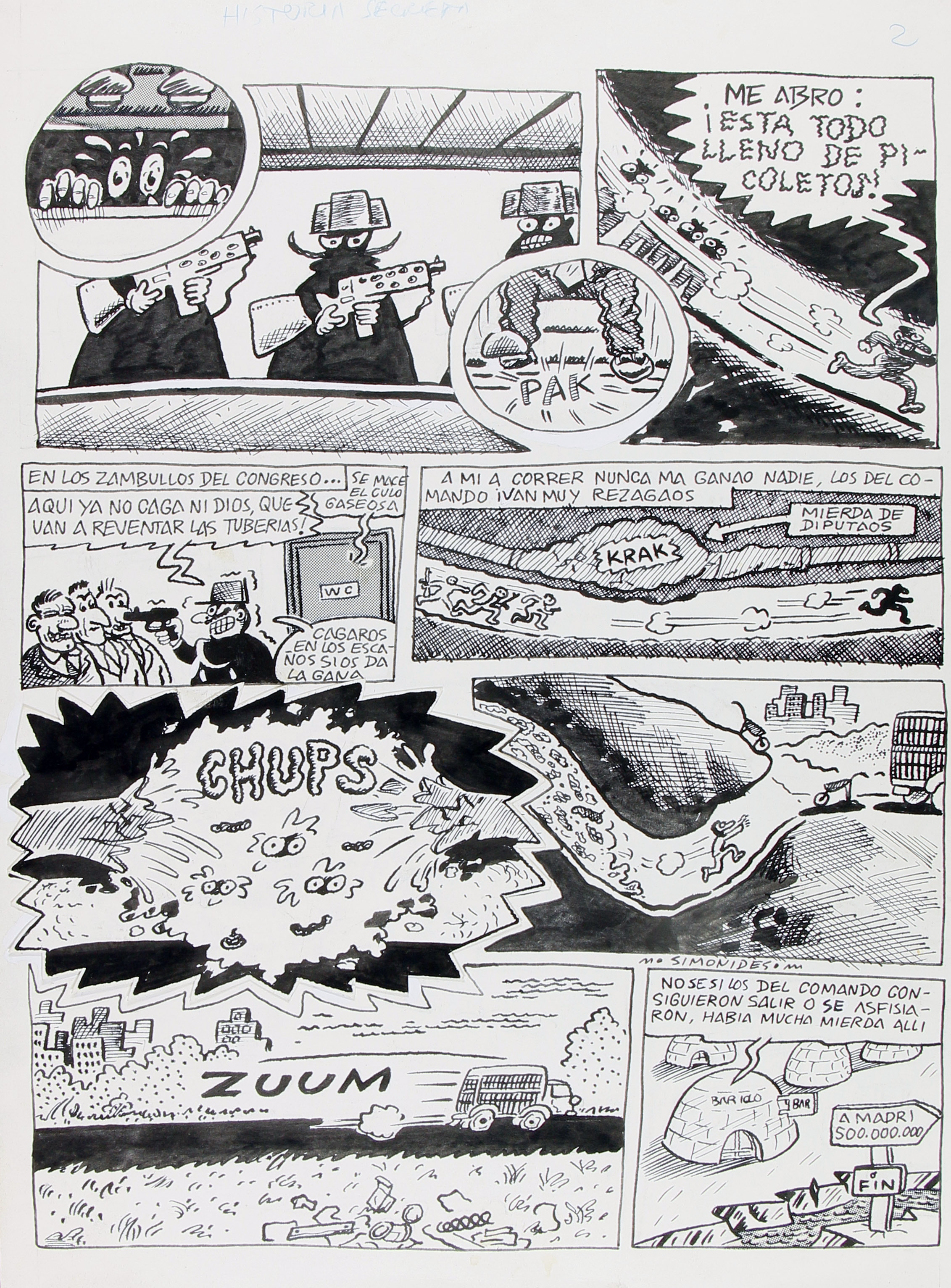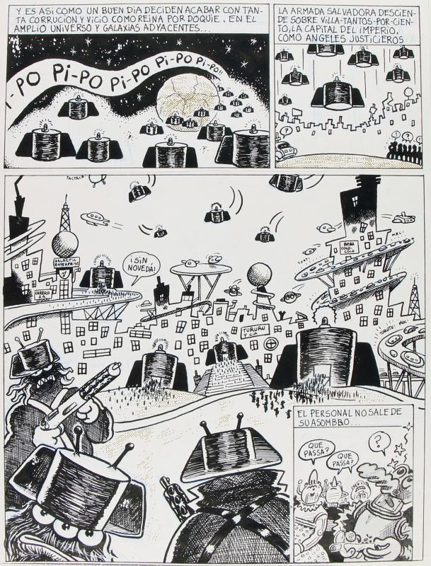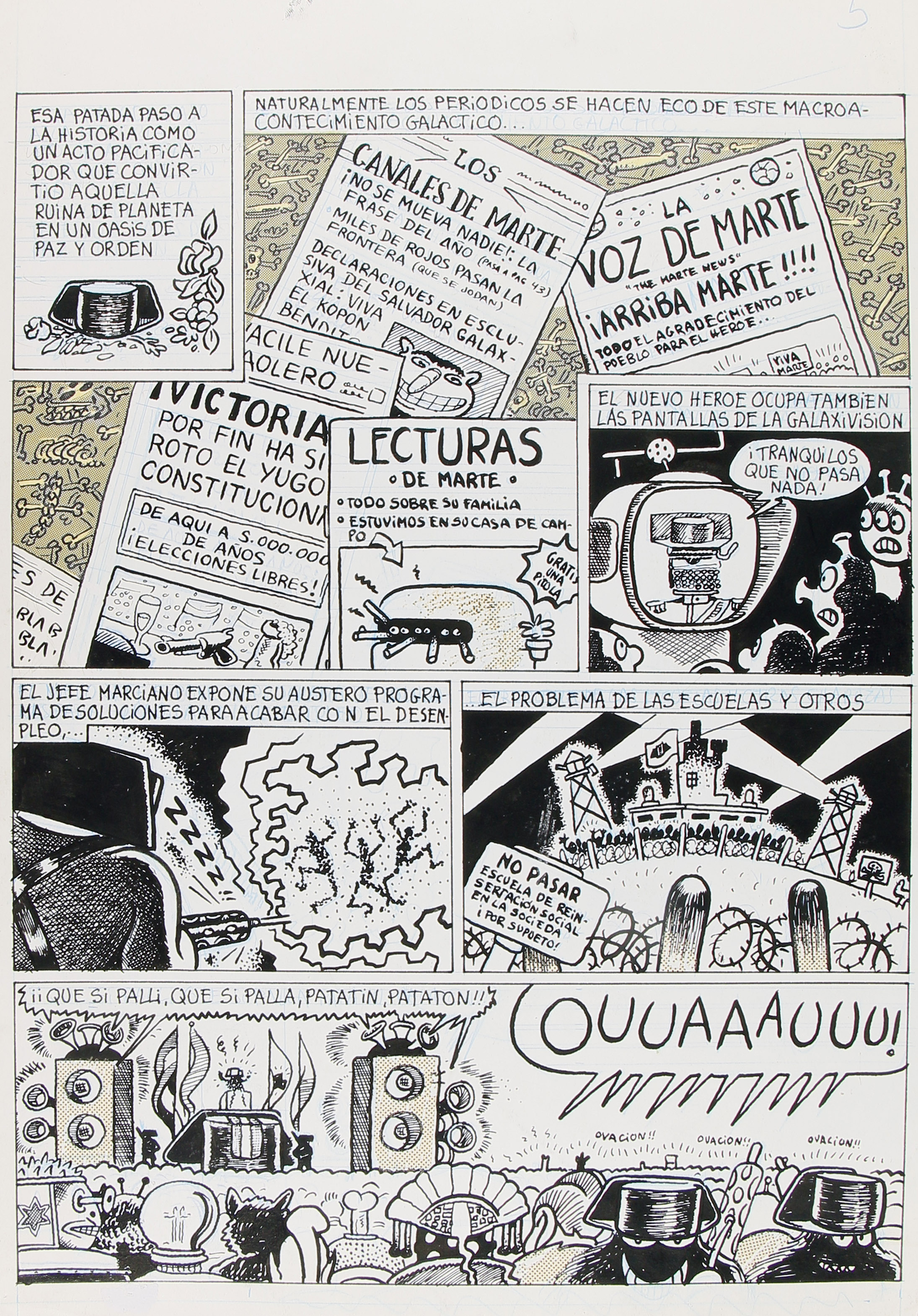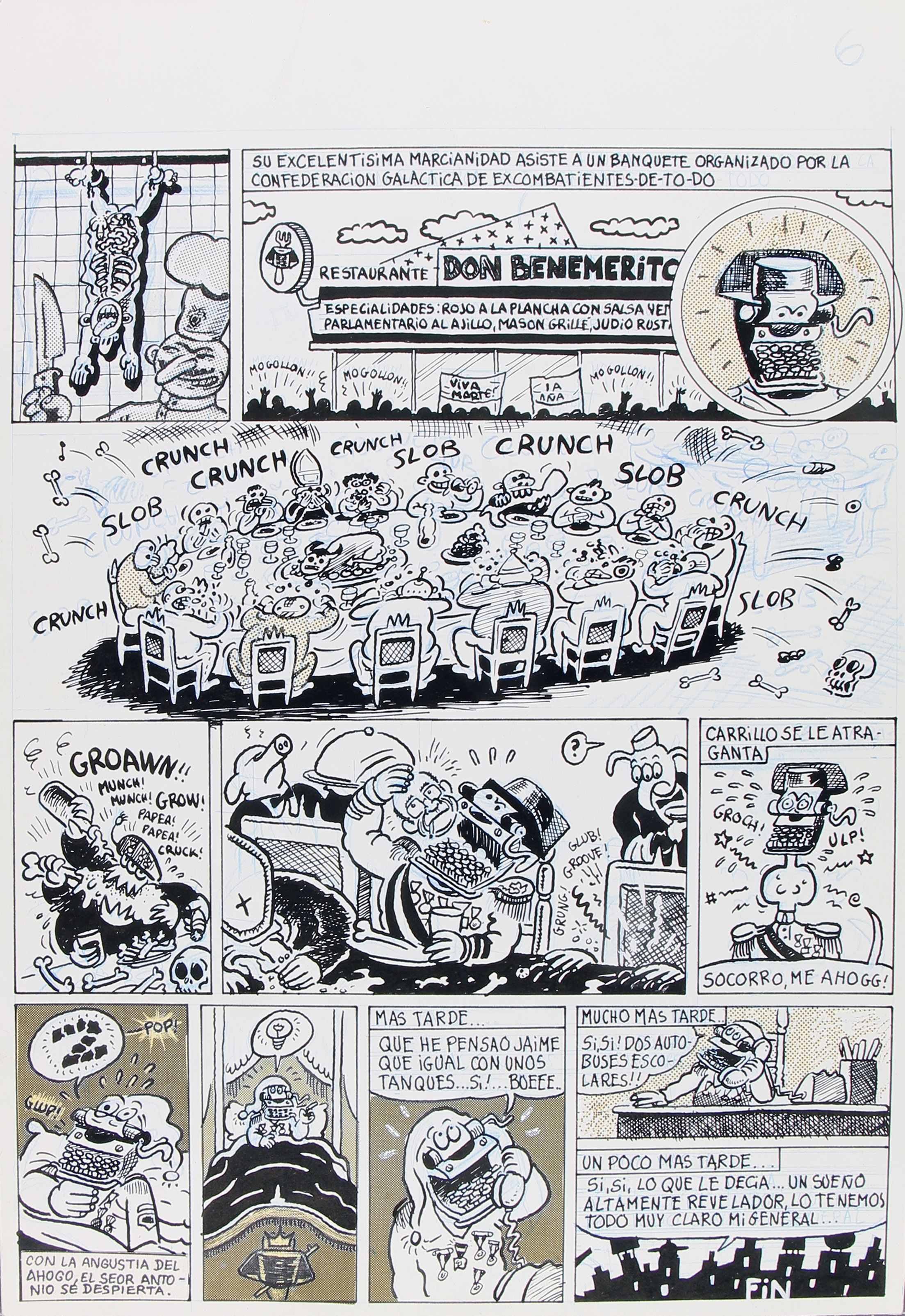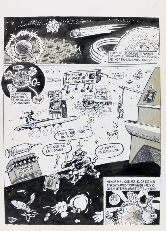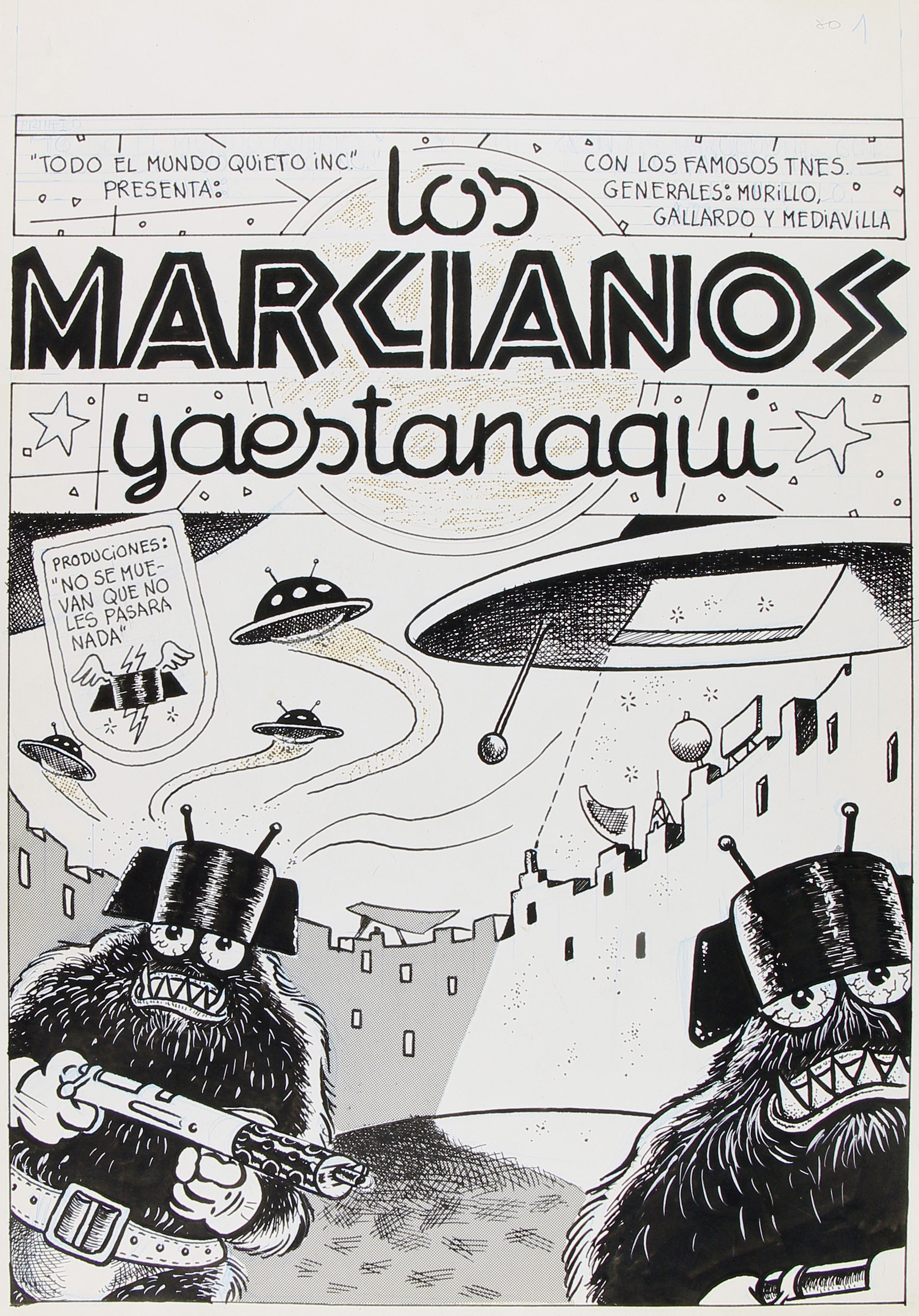 Historieta original de 6 pàgines del que aquí se'n conserven 5 (mancaria 1) amb 1 pàgina extra inclosa al pléc original amb l'anotació de "Historia secreta" que no formarà part del còmic final, publicat al número especial El Víbora Toda la verdad sobre el golpe (1981, pàgines 29-34, FMG000017). Signat amb Murillo i Mediavilla, presenta una invasió de tricorns de guàrdies civils en forma d'OVNI que arriben a un planeta similar a Espanya trencant la constitucionalitat i celebrant un banquet al restaurant Don Benemérito amb la "excelentísima marcianidad", qui es menja a Carrillo.
