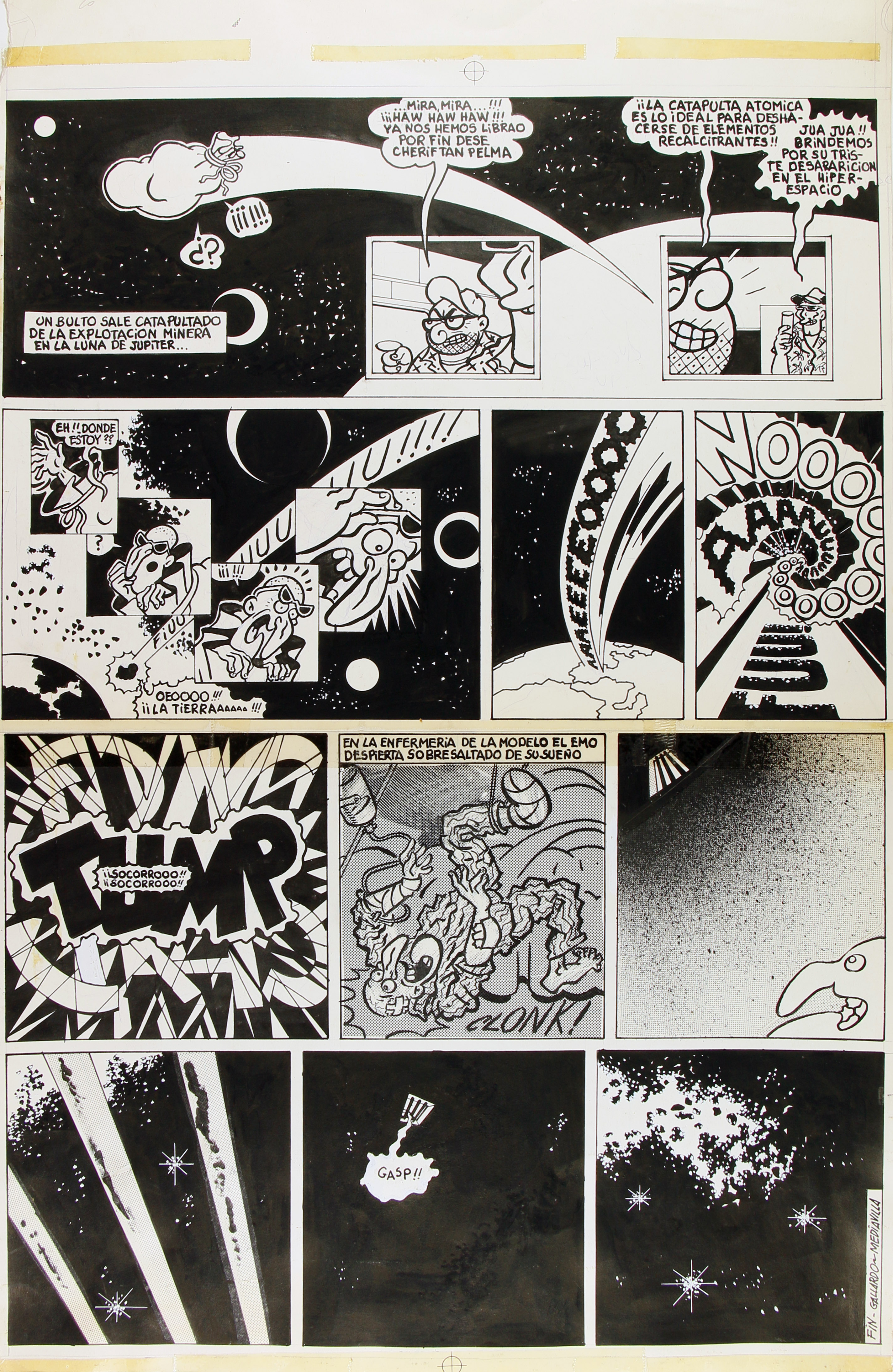 Historieta amb títol al dors segons inscripció publicada al número 24 de la revista El Víbora, on Tío Emo i companyia visiten una cantina alienígena al planeta Júpiter (segons portada a Com ser Gallardo, 2006) i apareix un monstre d'ulls i budells. Emo es llençat al planeta Terra on desperta del seu somni a la presó Model. Pàgines probablement desordenades en numeració (ordenades a partir de la _3 segons números consecutius al dors).