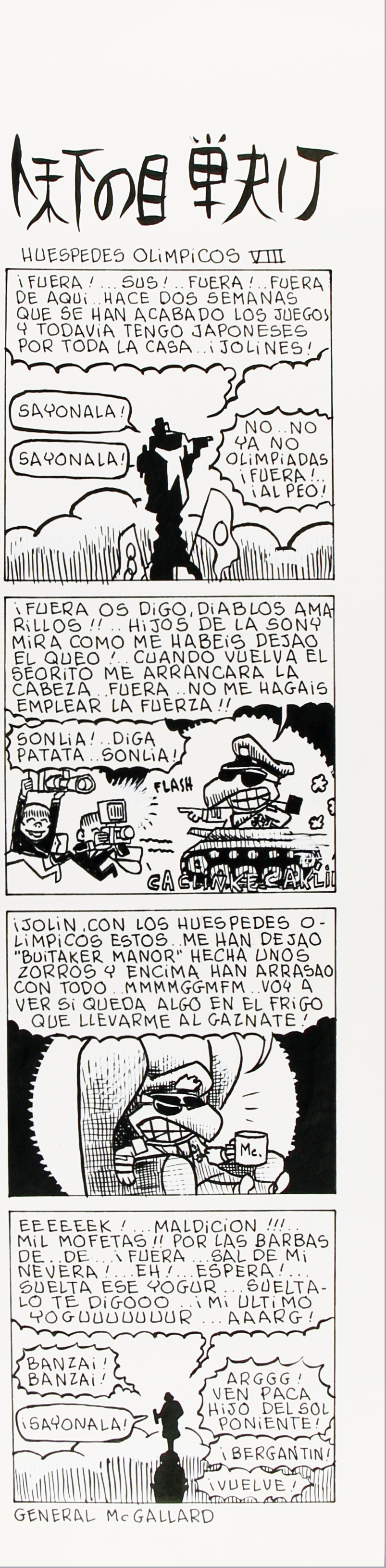 Tira de còmic de Buitre Buitaker (títol possiblement retallat) on Buitre està enfadat per la presència de japonesos als Jocs Olímpics, publicat a l'ABC sense data específica (entre 1988 i 1992).