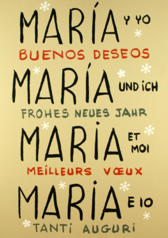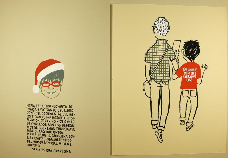 Carpeta promocional de María y yo (2007) amb títols a la portada en alemany, francès, italià. A la primera pàgina interior hi ha un retrat de María amb barret de Pare Noel i a la segona interior s'hi annexa una làmina del dibuixant i María d'esquena amb el text "I'm unique just like everyone else".