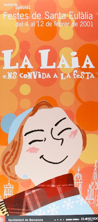 Cartell per a les Festes de Santa Eulàlia amb el lema "La Laia ens convida a la festa", realitzades del 4 al 12 de febrer de 2001. Apareix el personatge de la nena Laia somrient i ulls tancats, amb bufanda, barret d'hivern i un fons de bombolles de colors i vistes de la catedral de Barcelona, entre altres edificis.