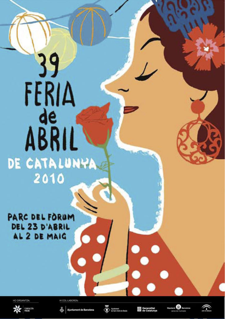 Cartell per a la 39 Fira d'abril de Catalunya de 2010, celebrada al Parc del Fòrum entre 23 d'abril i el 2 de maig. Apareix una senyora vestida de faralaes i peineta, olorant una rosa, amb un fons de farolillos i el text de la informació de l'esdeveniment.