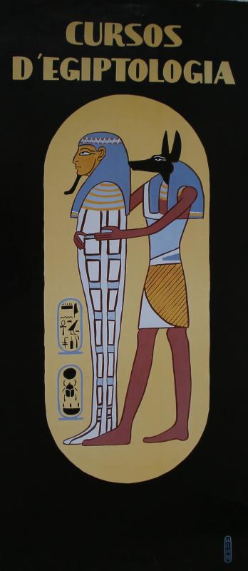 - Cartell de Cursos d'Egiptologia sense especificar dates o lloc. Apareix el déu Anubis preparant una mòmia amb diferents jeroglífics a la part inferior esquerra.