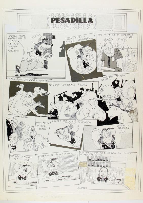 Còmic d'una pàgina de la revista "Disco Expres", al voltant de 1976 ("circa 1976" segons dors), on un ratolí camina per la ciutat amb els seus malsons que vol oblidar, finalment una màscara d'un personatge que s'oculta.