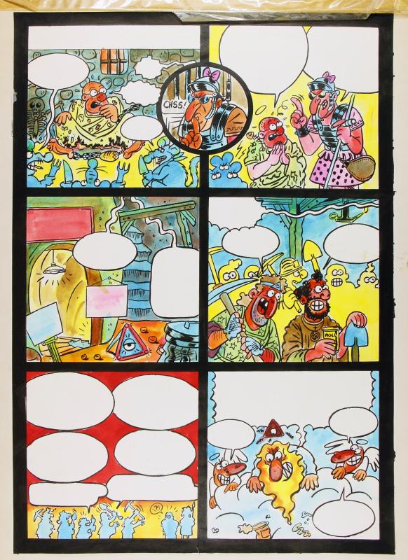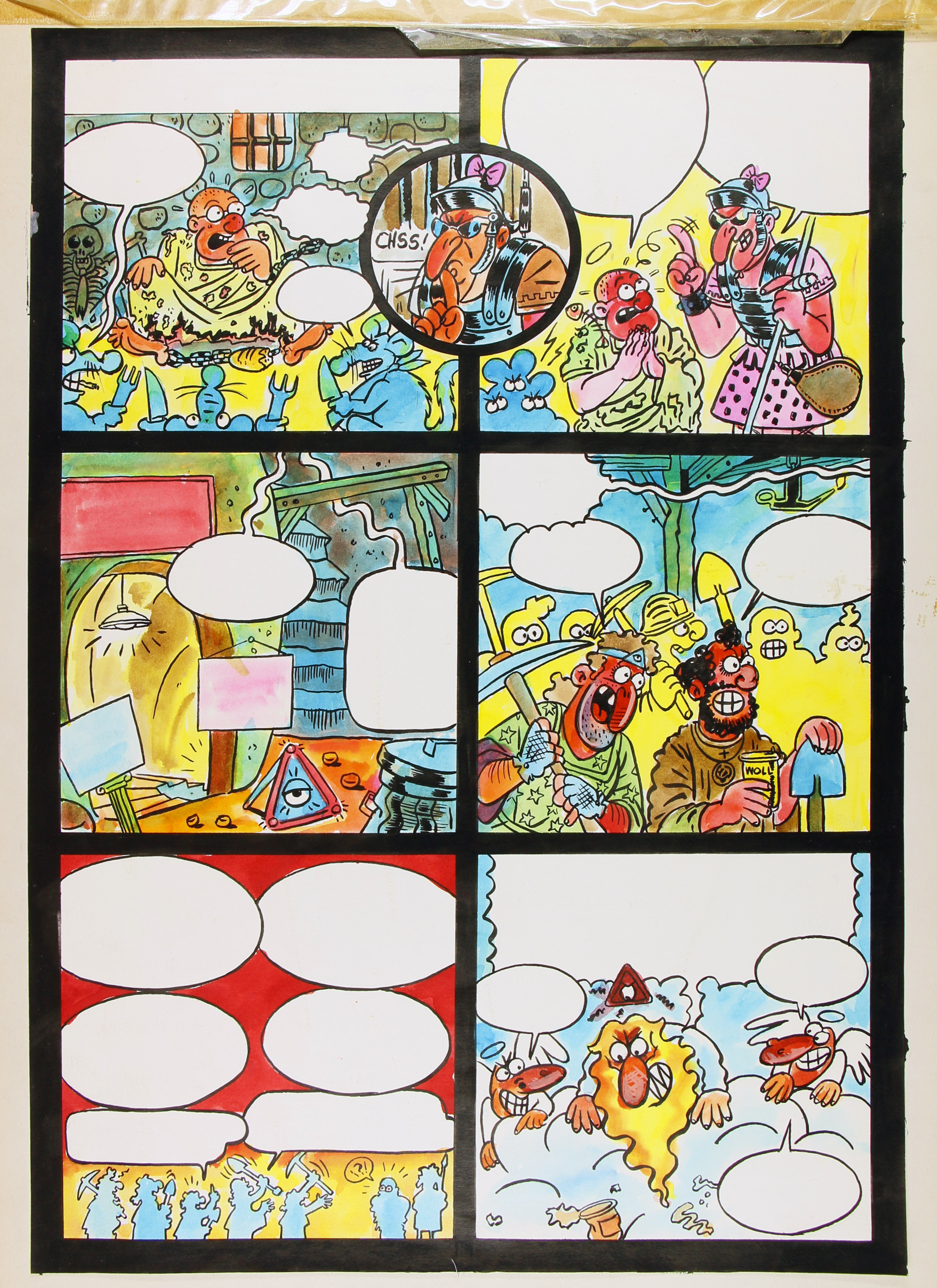 Pàgina de còmic amb bafarades sense text publicat al número 8 de La historia vista por detrás (FMG000045: pàgina 19), corresponent al moment en que un dels primers cristians destinat a Roma es empresonat però alliberat pel mateix soldat que porta el cristianisme en secret.