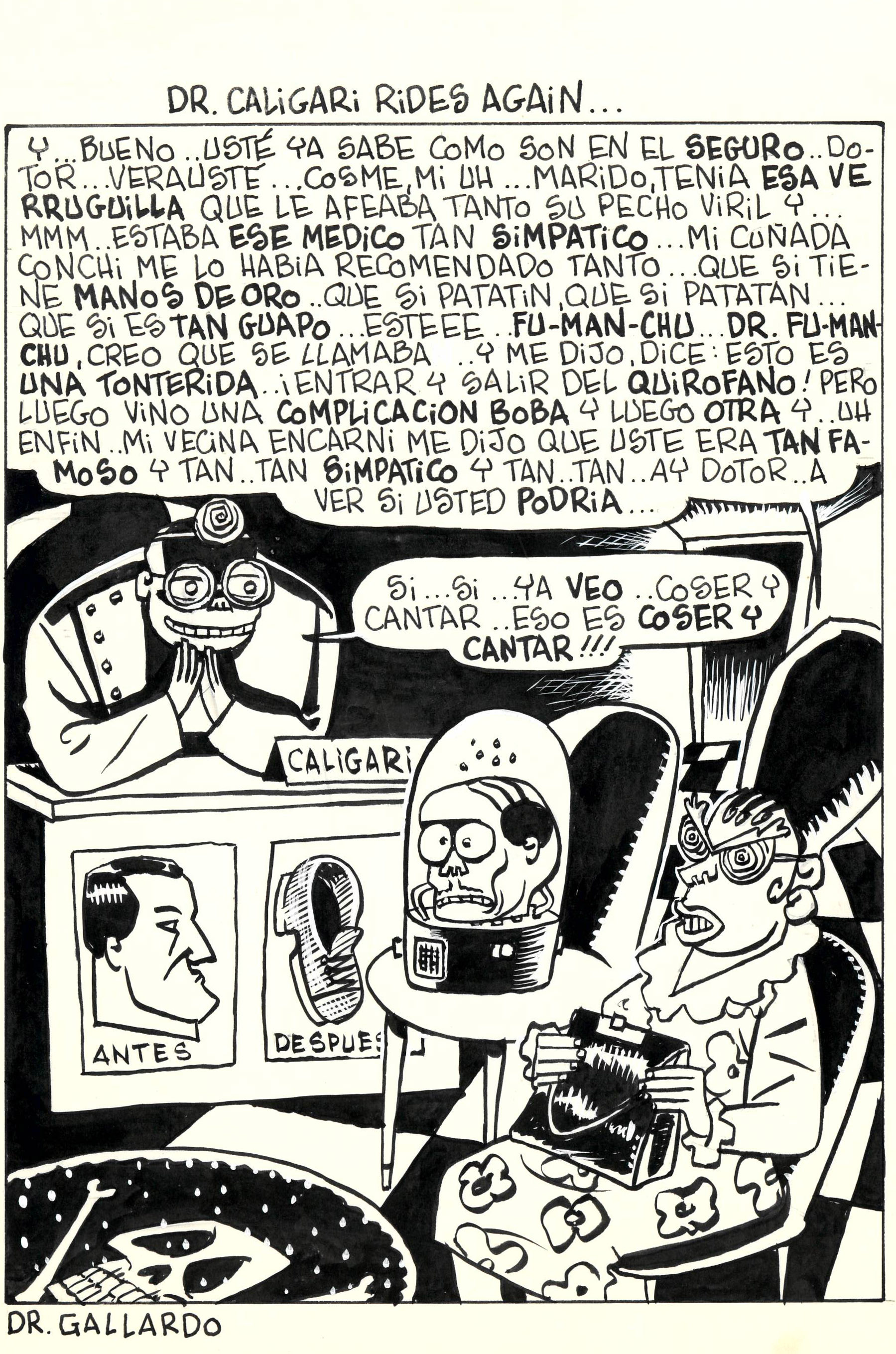 - Còmic d'una vinyeta sense datació ni mitjà destinatari, possiblement ABC, on una senyora demana ajuda al Dr. Caligari perquè recomposi al seu marit, del que només queda el cap en una càpsula.
