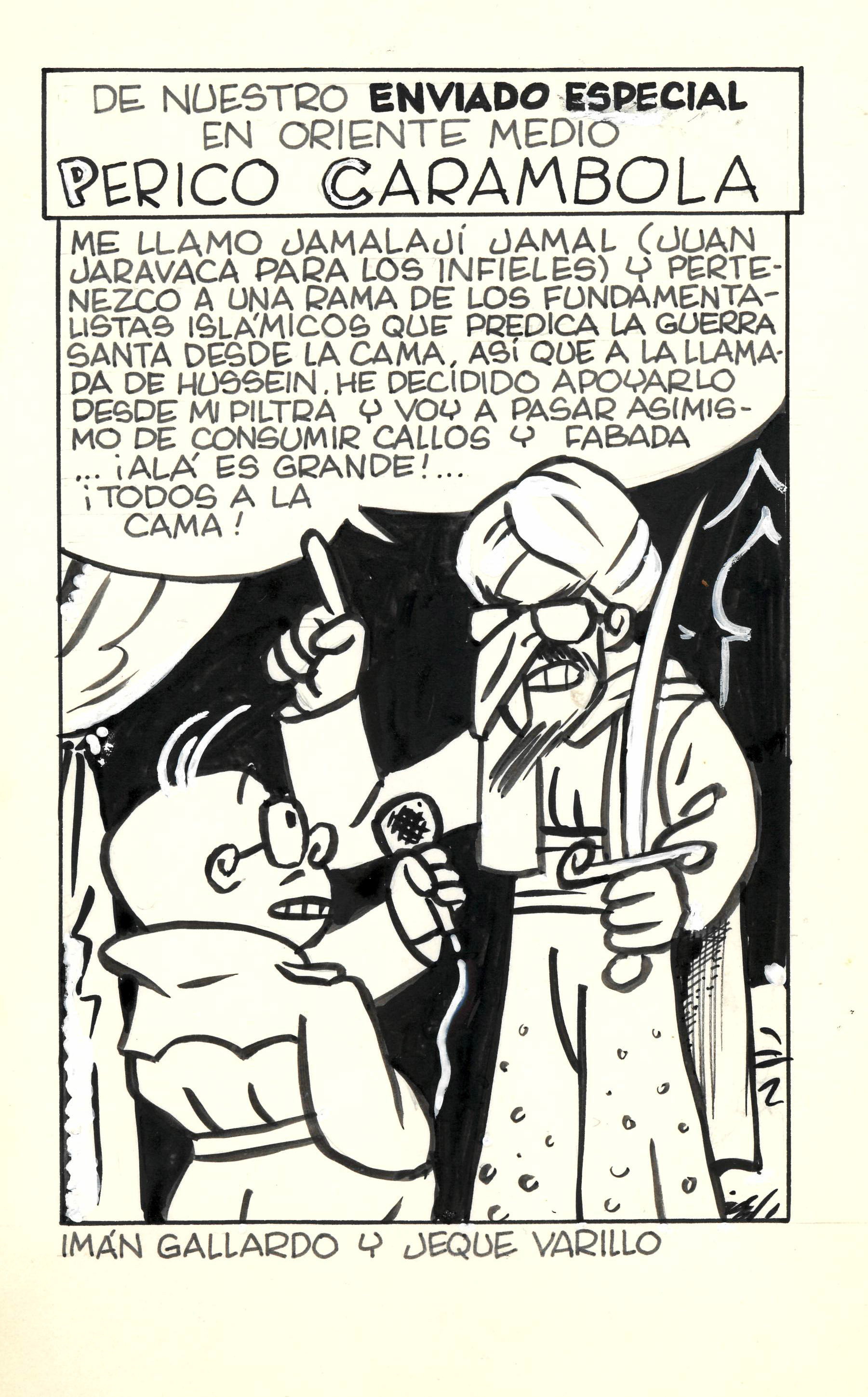 - Còmic d'una vinyeta sense datació ni mitjà destinatari, possiblement ABC, on Perico Carambola entrevista a un fonamentalista islàmic que recolza a Hussein.