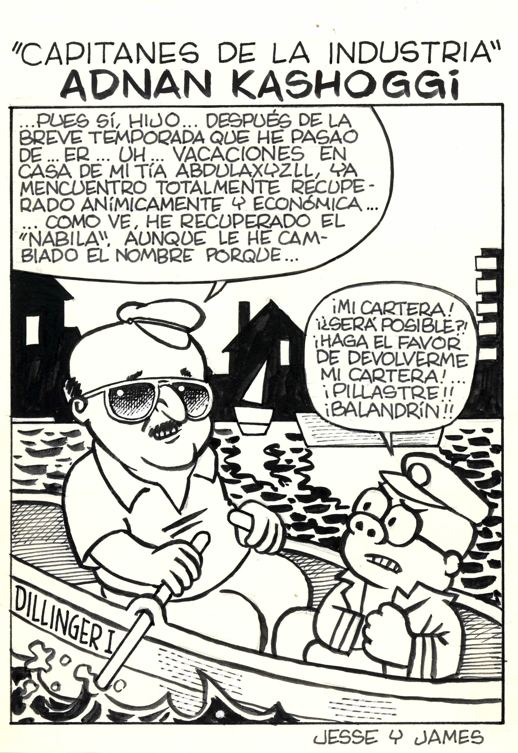 - Còmic d'una vinyeta sense datació ni mitjà destinatari, possiblement ABC, on Perico Carambola? navega amb una barca amb Adnan Kashoggi, a qui l'acusa d'haver robat la seva cartera.