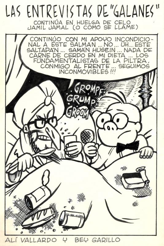 - Còmic d'una vinyeta sense datació ni mitjà destinatari, possiblement ABC, on Perico Carambola entrevista un musulmà, Jamil Jamal, que recolza a Hussein, des del llit.