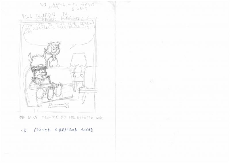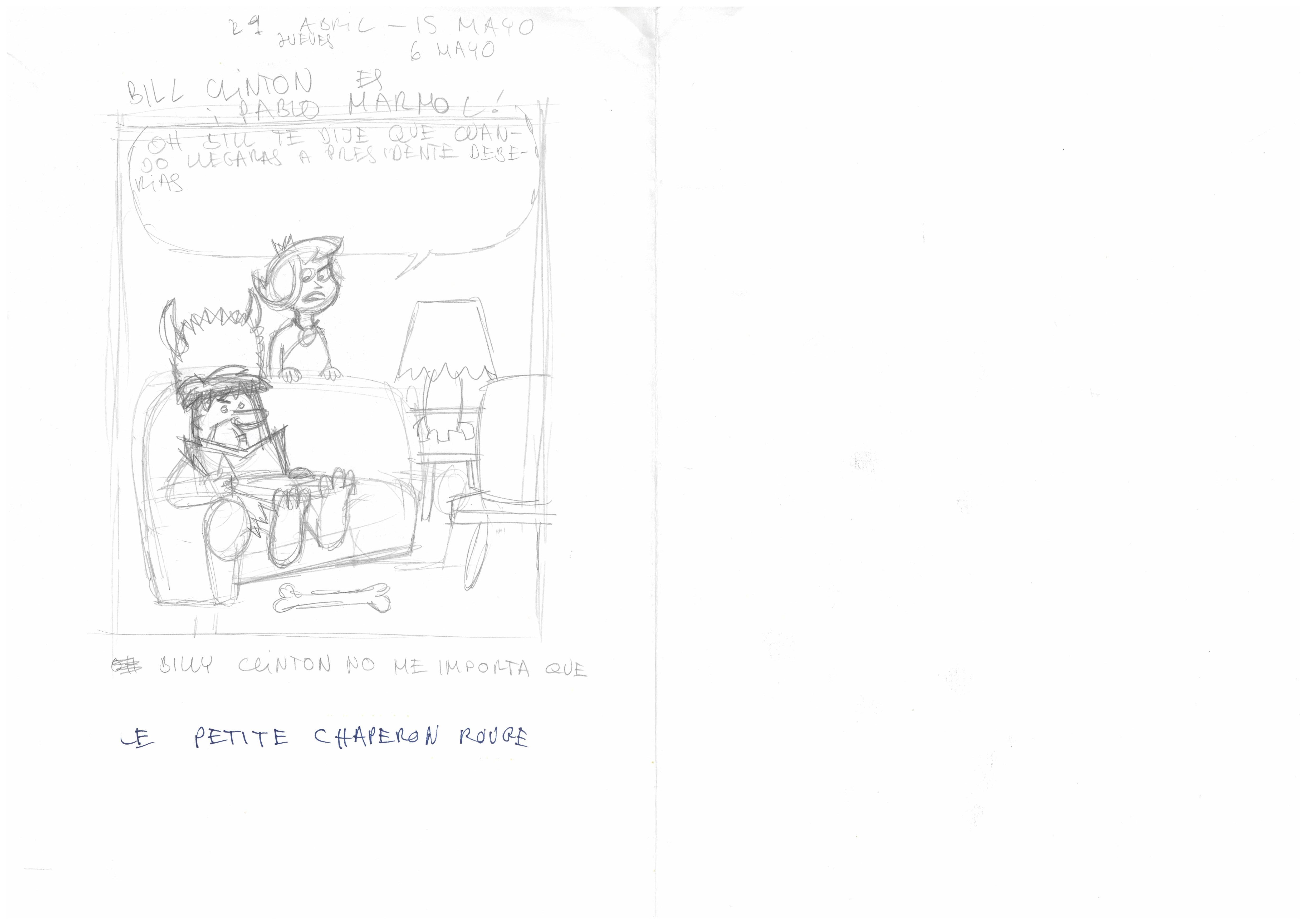 - Esbós de la carpeta anomenada "Chistes ABC Gente y aparte" sense un títol o personatges específics, on apareixen Pablo Mármol amb una espècie de barret amb banyes assegut al sofà i Betty al seu darrera amb una làmpara i un os.