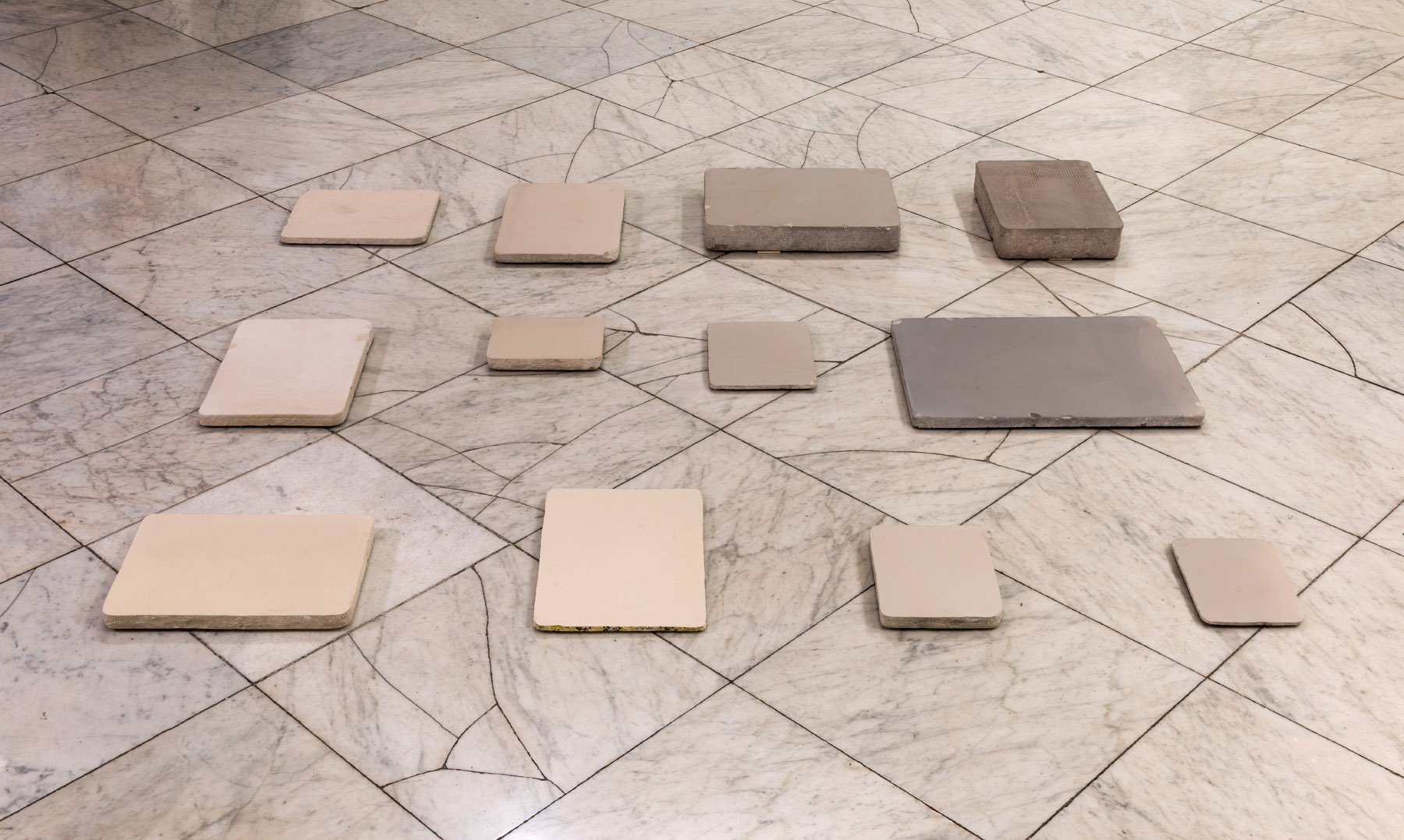 La litografia és una tècnica d’impressió descoberta el 1796 pel bavarès Alois Senefelder com a alternativa al costós gravat en coure. El seu nom deriva de les veus llatines lithos (pedra) i grafs (dibuix). Després de dibuixar amb un llapis greixós sobre la superfície llisa de la pedra, Senefelder va descobrir que les imatges podien entintar-se i imprimir-se repetidament en un paper. Touchpad recupera una dotzena de lloses de pedra que alguna vegada es van fer servir per a la indústria litogràfica. Cadascuna presenta una degradació particular i evidencia així el vincle existent entre la història cultural i la natural. Com més imatges reprodueix cadascuna de les pedres litogràfiques, més s’esvaeix la seva superfície material. A mesura que les impremtes tancaven o descartaven el treball litogràfic, moltes d’aquestes pedres esdevenien paviment per a carrers i espais urbans. Martín Llavaneras (Lleida, 1983) recupera aquesta història d’obsolescència emmagatzemada a les mateixes pedres, que són convertides en interfícies tàctils lítiques.