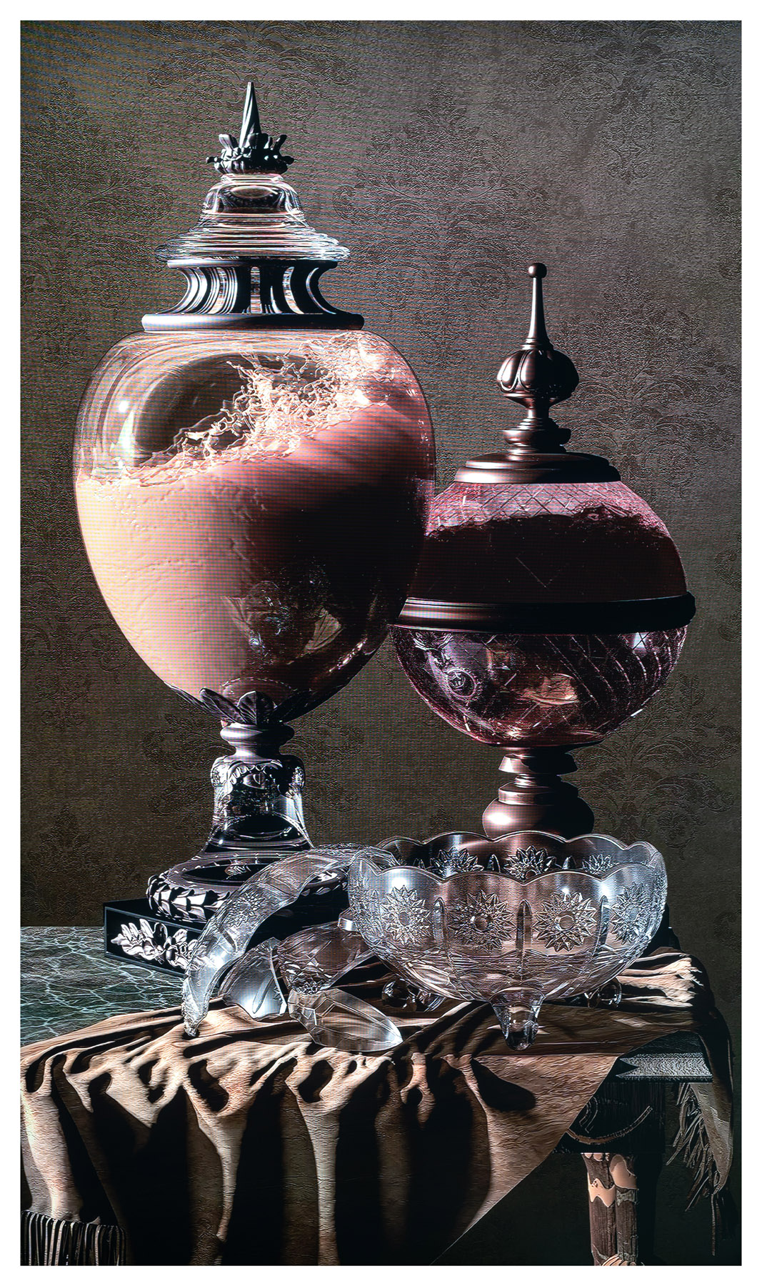 En aquestes natures mortes, Marina Núñez (Palència, 1966) representa uns successos impossibles, com impossible és el control del medi natural. Onades poderoses i tornados destructors miniaturitzats i continguts en dos fràgils gerros de cristall. En l’un, la paret està esquerdada i les estovalles que s’agiten ens revelen un vent creixent també a l’exterior. En l’altre, el nivell de l’aigua puja, hi ha fugides i veiem, ja, un recipient trencat. L’acabament formal remet a les natures mortes holandeses del segle XVII, amb el seu interès per la descripció realista i detallada, per la història natural i pel potencial simbòlic dels objectes. Natura morta és un terme que prové del neerlandès stilleven [vida immòbil], però, en aquest cas, els moviments de les onades i els tornados ens deixen clar que aquestes natures estan plenes de vida.