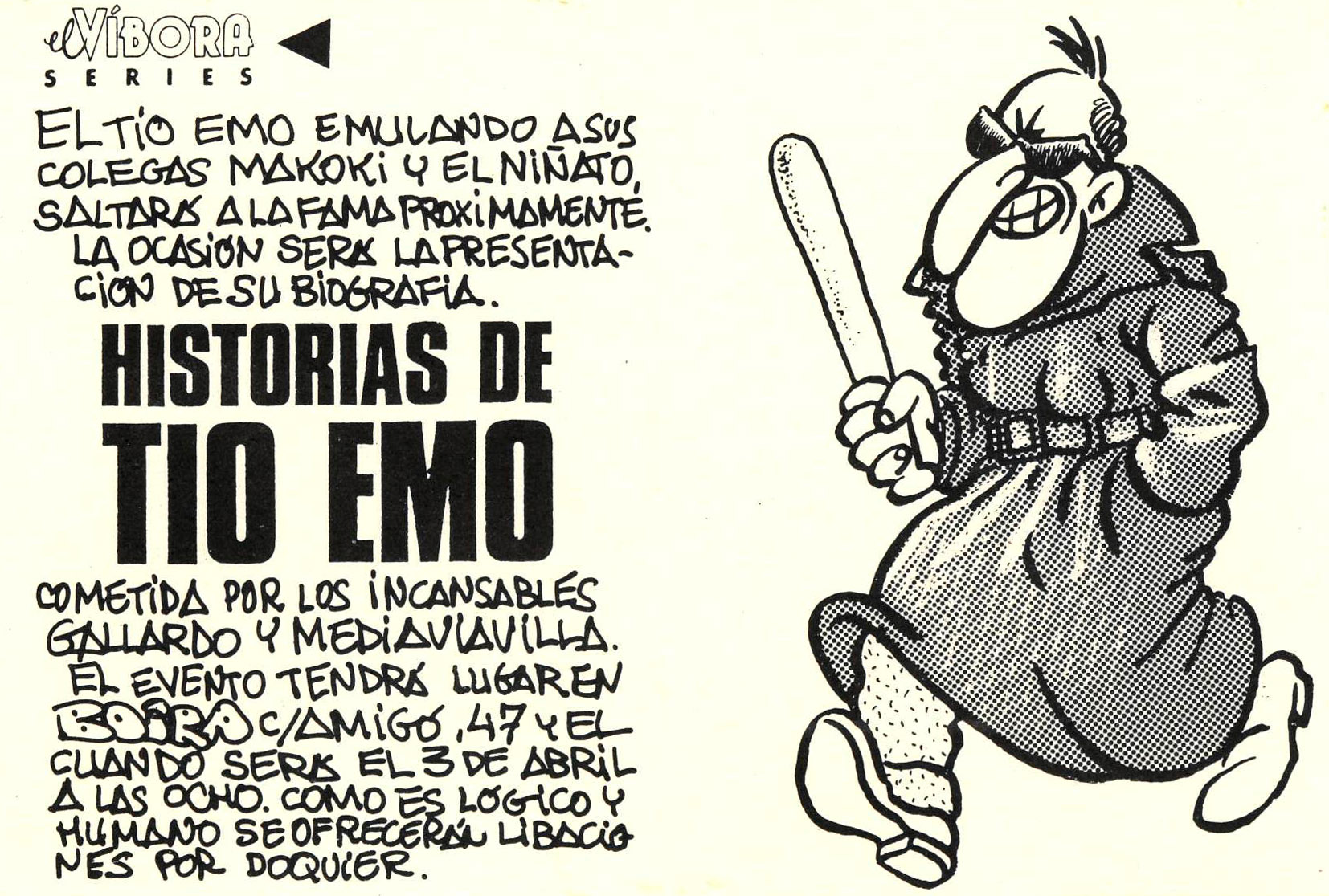 Targeta de presentació del llibre Historias de Tío Emo a Barcelona