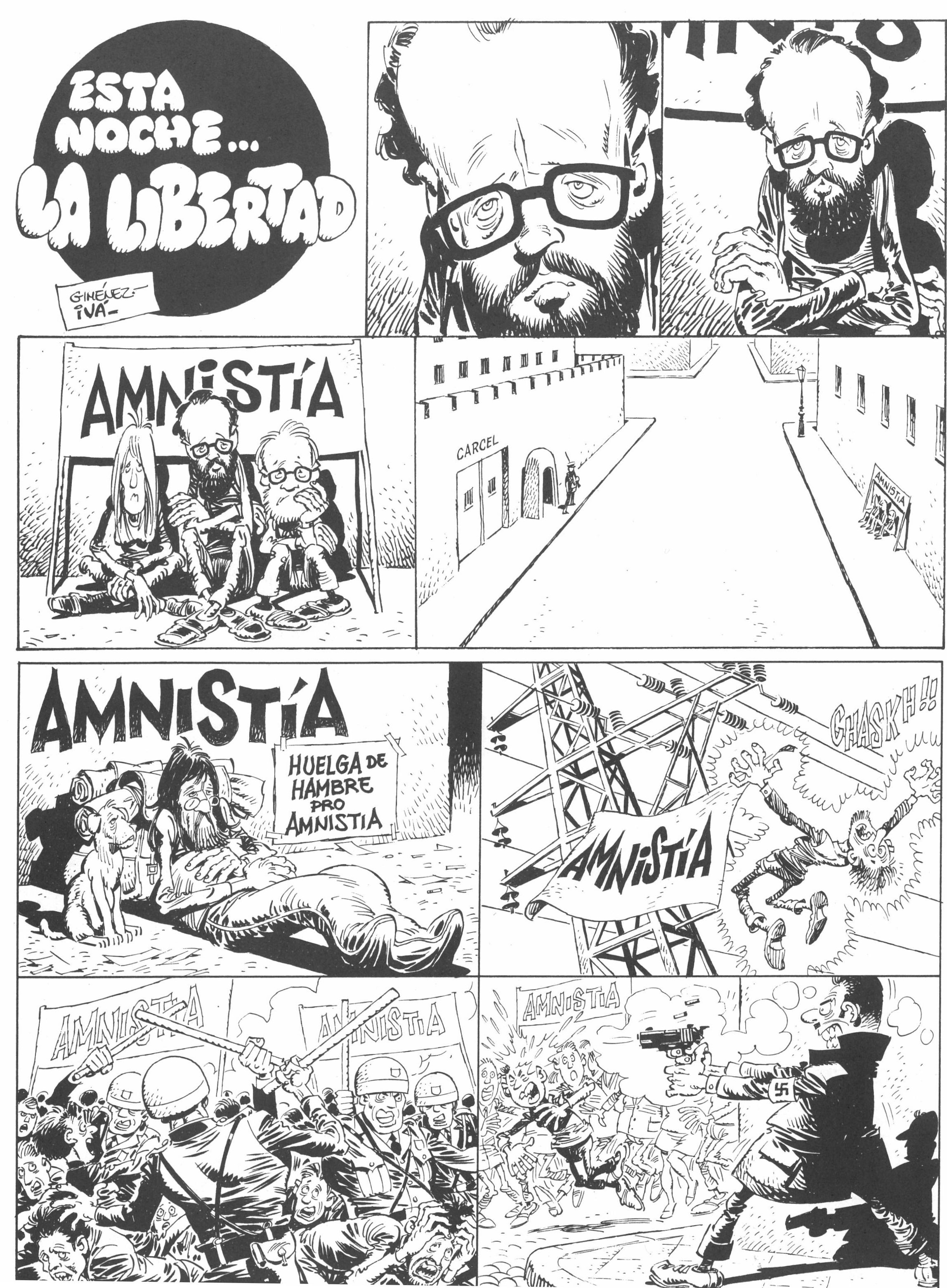 Entre Juliol de 1976 i Octubre de 1977, Carlos Giménez va col·laborar amb la revista"El Papus" —publicació per a la qual va realitzar algunes de les seves pàgines més compromeses— publicant en clau d'humor una sèrie d’històries curtes centrades en els anys de la Transició a l’Estat Espanyol, concretament en tres fets fonamentals en la vida política espanyola d'aquells anys: els primers mesos del govern de Suárez, el Referèndum per a la Reforma Política i les primeres Eleccions Generals de Juny de 1977. Giménez retrata amb absolut mestratge, entre la sàtira i el drama, una època convulsa, emmarcada per l'abans i el després de les primeres eleccions generals. L’Estat no acabava de sacsejar-se del jou franquista i l'amenaçaven enemics visibles i invisibles. El debat de l'esquerra, que Giménez explica sense traves, es redueix aquí a una qüestió essencial: convertir-se finalment en una societat nova i oberta, o continuar atenent-se a les servituds del poder econòmic i polític. L’any 1980 totes aquestes històries es recopilen en una sola edició de tres volums: España Una (Vol. 1), España Grande (Vol. 2) i España Libre (Vol. 3). Aquests dos originals corresponen a la història “Esta noche... la libertad” publicada al volum 2 (España Grande).