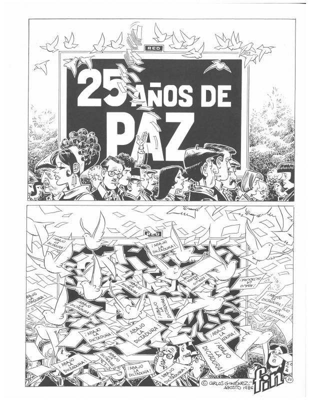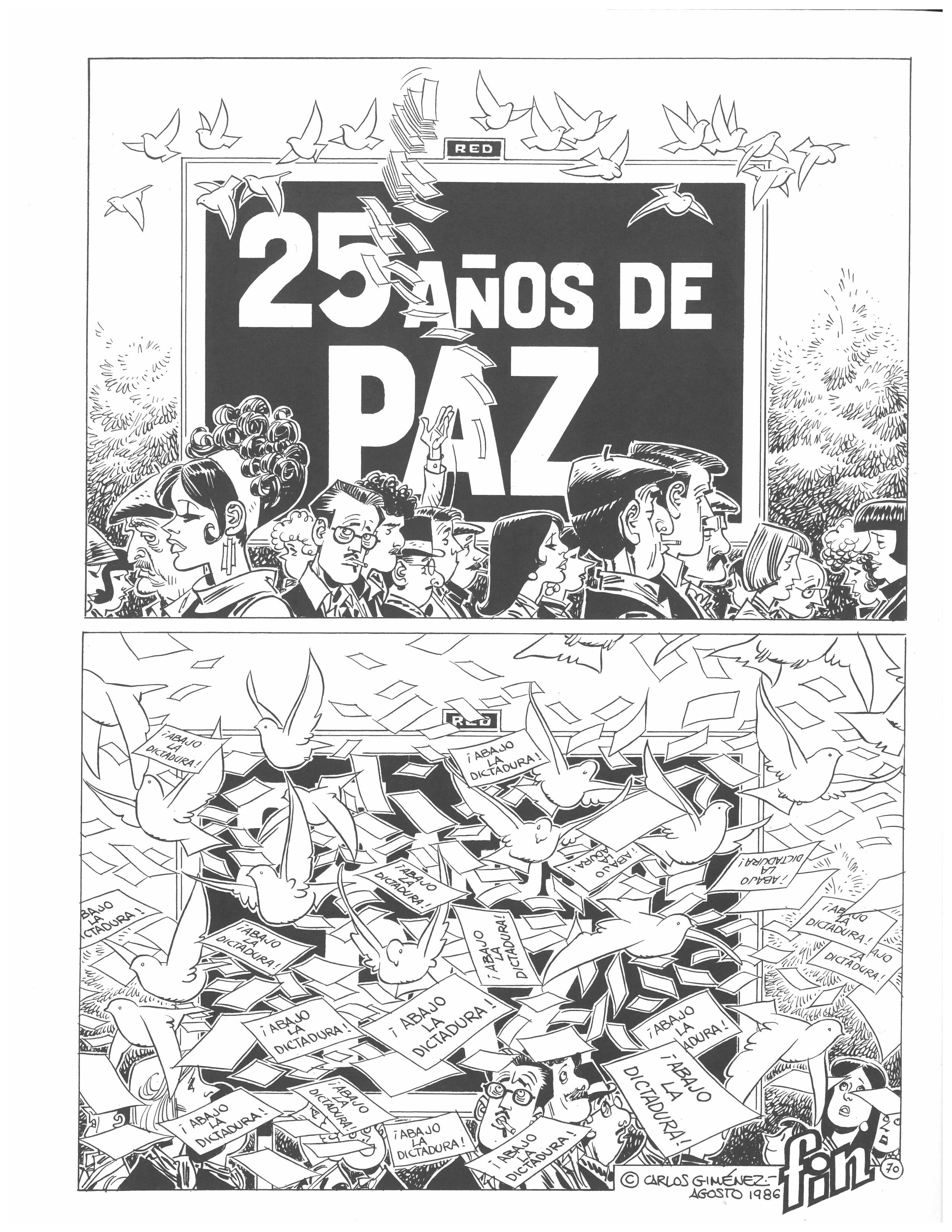 L’any 1985 Carlos Giménez va començar un àlbum amb què va voler retratar la seva ciutat d'acollida quan va venir a treballar a una agència d'il·lustradors: la Barcelona dels seixanta. A partir de les passejades per la Rambla dels seus personatges, va reflectir l'ànima barcelonina en històries creuades: parelles d'enamorats, venedors que ho han vist tot, noctàmbuls empedreïts, nens que juguen, artistes de carrer, prostitutes veteranes, insubmisos al franquisme. Englobada anteriorment dins de la sèrie Los Profesionales, amb les quals comparteix alguns protagonistes, aquesta obra, però, és més aviat una crònica social de l'Espanya de Franco. Ambientada a la Rambla barcelonina, 25 anys després de la fi de la Guerra Civil, Carlos Giménez, amb l'ajuda d'una mostra de personatges variats, descriu amb humor, amb tendresa i amb ira aquella Espanya subjugada. Els cinc originals d’aquesta sèrie representen una seqüència d'imatges d'un dels episodis de l’obra, amb un allunyament des del concepte 'Franco' sobre el cartell de celebració de la Pau i després un altre tràveling partint de l'acrònim RED (en anglès, vermell) que ens porta a una pau ocultada per les octavetes dels contraris a la dictadura.