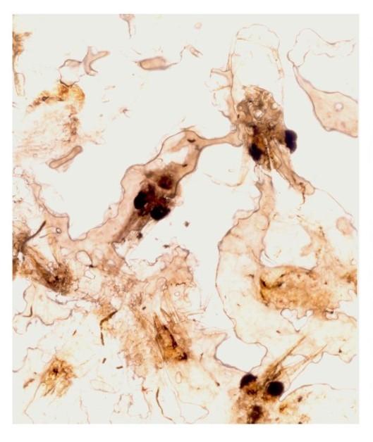 Frozen fish food és menjar congelat per peixos d’aquari. És el mateix que mengen els peixos que viuen lliures als mars, rius i llacs de la Terra: krill, artèmia, mysis, larves de mosquit blanques, vermelles o negres. Aqueta sèrie del 2001 semblen paper pintat estampat amb motius d’animals. Metafòricament Frozen Fish Food parla de nosaltres, els humans, que ens pensem lliures però és una il·lusió. Mengem congelats i encara coses pitjors, i estem tan atrapats com peixos en un aquari. Des de la pesca intensiva, l’abocament de tot tipus de residus i plàstics, el vessament de carburants i petroli, la mineria marina, l’augment de la temperatura de l’aigua fins a la catàstrofe nuclear de Fukushima que va provocar la més gran contaminació radioactiva marina de la història amb conseqüències irreversibles, les activitats humanes tenen un indiscutible impacte negatiu sobre la biodiversitat oceànica: n’alteren l’equilibri i n’amenacen la supervivència. Frozen Fish Food, i tots els altres treballs de la mateixa sèrie, són fotogrames. El fotograma interessa Aleydis Rispa perquè és un procés tècnic directe i simplificat. No cal càmera fotogràfica per obtenir les imatges sinó que aquestes sorgeixen pel simple dipòsit d’un objecte damunt d’un paper sensible exposat a la llum. Els objectes fotogramats deixen la seva empremta directament sobre l’emulsió fotosensible, paper o pel·lícula. Es tracta doncs de la mínima expressió de la fotografia, n’és l’essència.