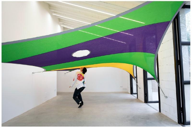 KITE és una obra creada per al context rural de l'Empordà i que fa referència al vent com a element amb què el cos interactúa, i com a característica ubiqua de la regió. Es tracta d'una escultura-escenari realitzada en tela tècnica i elevada mitjançant un sistema d'ancoratge a les parets, que l'artista activa amb una performance explorant els sons del vent com a transitor i possibilitador de la veu. Es una proposta, a mig camí entre la instal·lacio i la performance, que parteix de les formes d'objectes de joc i d'esport del mitjà de l'aire. La investigació comença des de l'estel com a objecte de tradició mil·lenària i vinculada a disciplines com l'estratègia militar i l'obsessió de la conquesta de l'entorn aeri per part de l'home. La peça final, KITE, condensa referències a la vela nàutica, ja feta servir per la cultura romana en els seus “velarium” com a tendals per bloquejar el sol en complexos sistemes dissenyats per enginyers que cobrien espais com el Colisseu; i portada al món contemporani de l'ús lúdic de la tecnologia a través els colors reconeixibles de les veles de windsurf i els esports d'aire i aigua.
