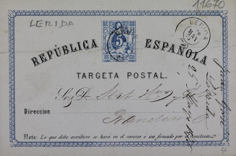 - Targeta postal enviada per Juan Gosé als Germans Sert i Solà el 26 de maig de 1875. Tampó en la part posterior de Juan Gosé. Lérida