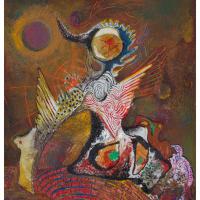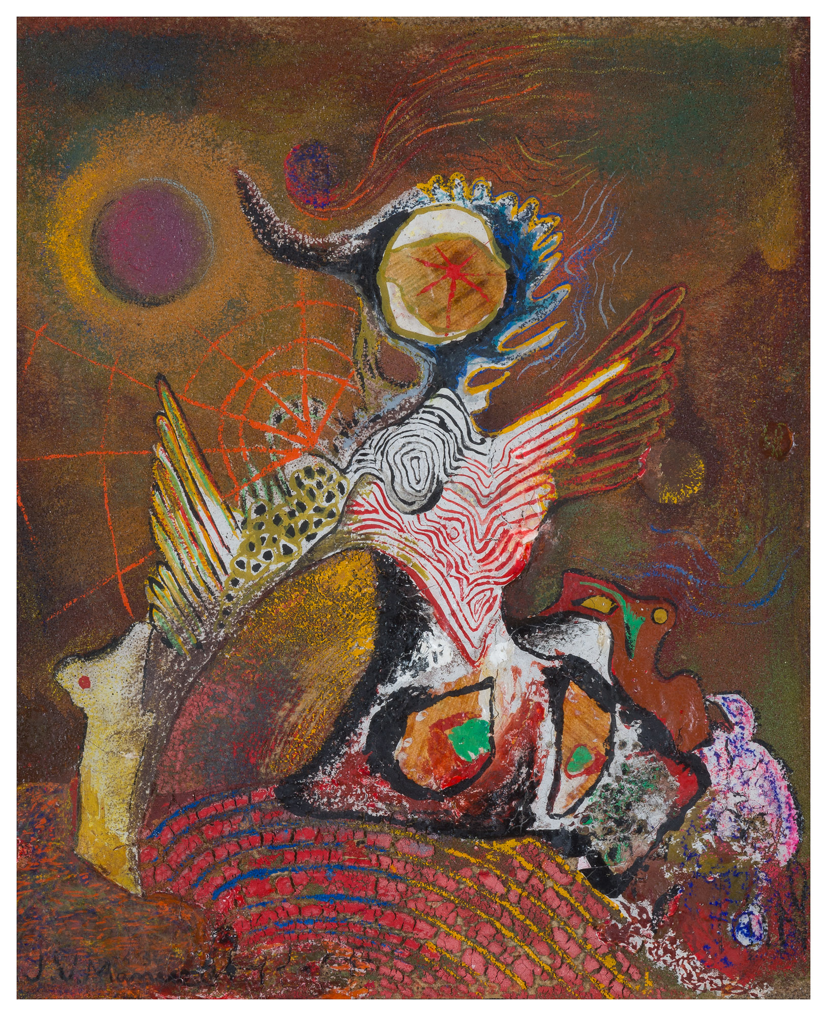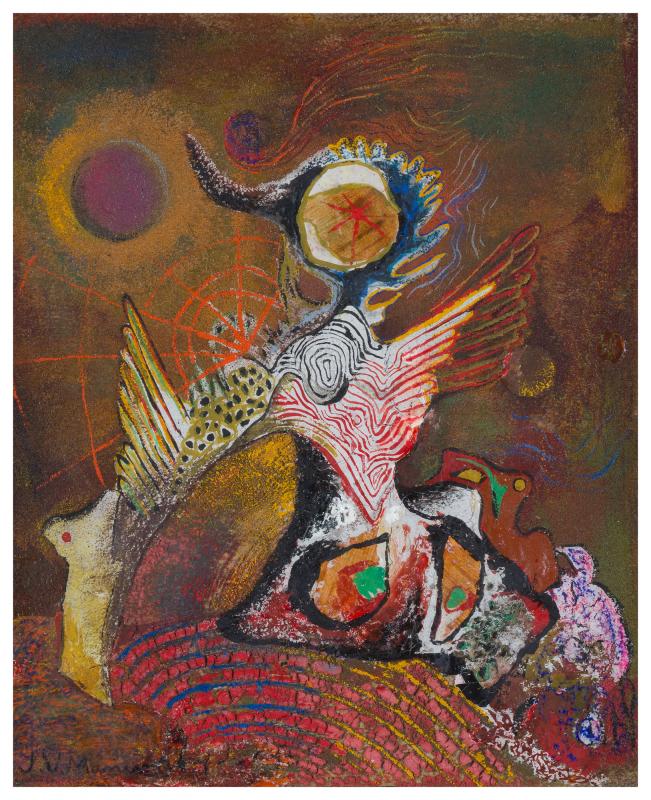 Aquest guaix de Manuel Viola, inèdit, és probablement la seva primera obra pictòrica coneguda. Va ser creada en unes circumstàncies històriques extraordinàries que el transformen en un testimoni excepcional. Viola havia entrat en contacte amb el surrealisme en una edat molt jove, cap al 1930, a través del grup de Lleida en què militaven Antoni Garcia Lamolla i Leandre Cristòfol. Les obres d’aquests artistes, com és conegut, adoptaven un surrealisme subtil, amb una paleta restringida cap als grisos, blaus i blancs i amb preponderància del dibuix. Aquí en canvi, ens trobem amb una obra de força i afirmació, ben propera a les imatges carregades de color i impuls que omplen els escrits de Viola a La Main à plume (la revista de caràcter surrealista que el seu grup de publicava clandestinament en el París ocupat). La figura, que recorda a un ocell amb un enorme ull tractant d’emprendre el vol amb unes ales un pèl curtes, s’aixeca davant nostre amb un gest d’esforç suprem, per mostrar-se amb tota la seva potència i riquesa intensament irisades, mentre al fons sembla cridar-lo una esfera de color lila, la qual té l’aspecte d’un sol amagat per l’eclipsi. És una d’aquelles “maravillosas apariciones” de les què parla Viola quan escriu.les imatges surrealistes de Viola sempre són combatives, ja que, com hem vist, entenia el surrealisme com una forma de destrucció i superació d’una realitat denigrant. En el nostre cas concret, tenint en compte el moment específic de la seva creació, és fàcil veure-hi el símbol de l’artista combatent que, un cop més, s’aixeca contra la injustícia en un ambient encara incert, però amb indicis d’esperança.
