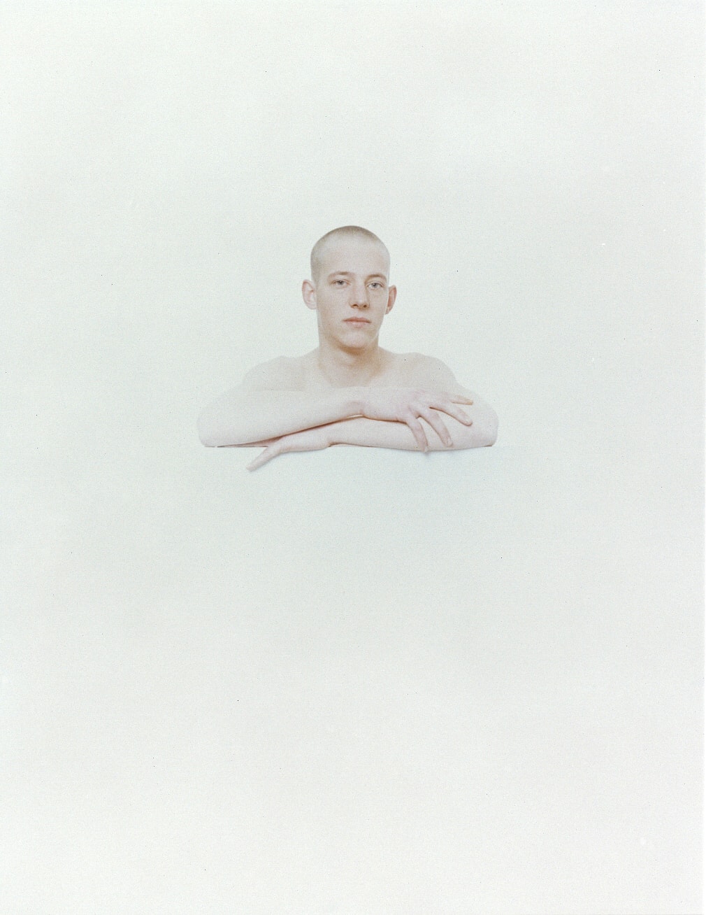 Aquesta fotografia pertany a la sèrie Retrats (1993), nou bustos masculins i femenins presentats a Lleida en el marc de l’exposició “Missatges xifrats” (1994), que emfatitzen la ingravidesa del nu a partir de la blancor de l’anatomia i el gest translúcid dels cossos representats, i on destaca per sobre de tot l’entorn humà de l’artista —els rostres pertanyen a persones joves, a amics d’edat propera a la seva, — i el fons blanc, que en sèries posteriors com ara Què mires? (1994) i Retrats (1995) es transformarà en negre.