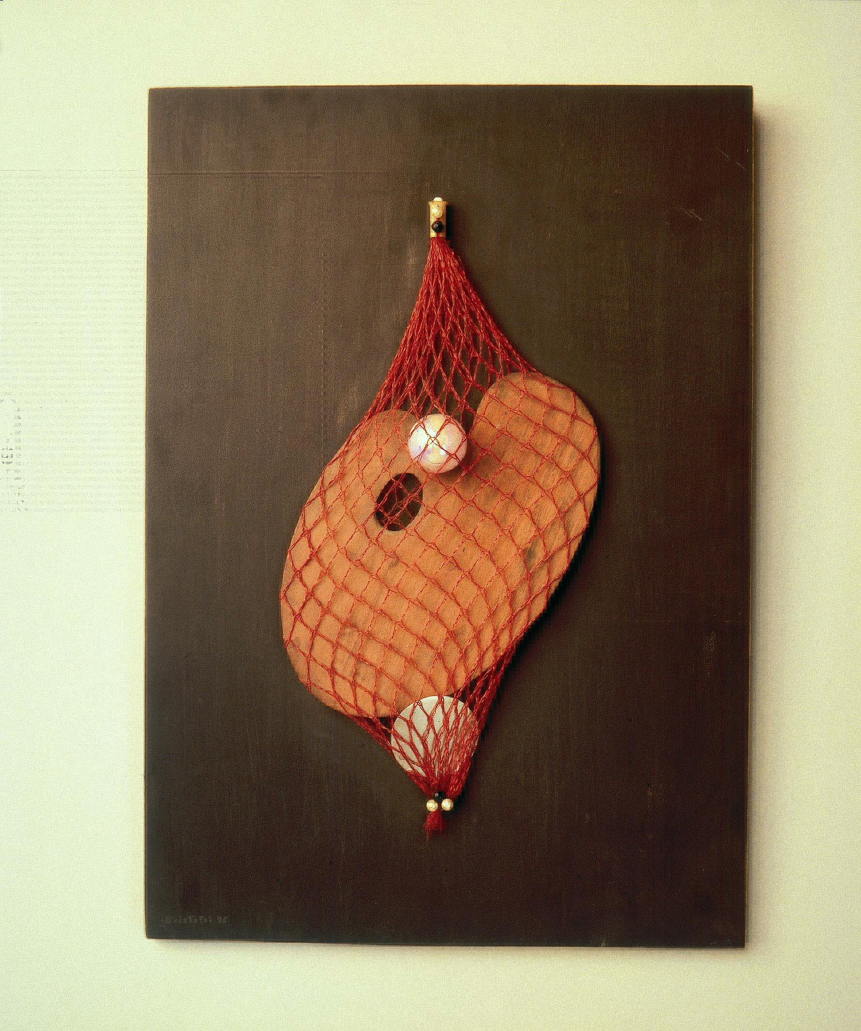 Xarxa de plàstic, paleta, bola de nadal, metall i agulles de cap sobre base de fusta tenyida