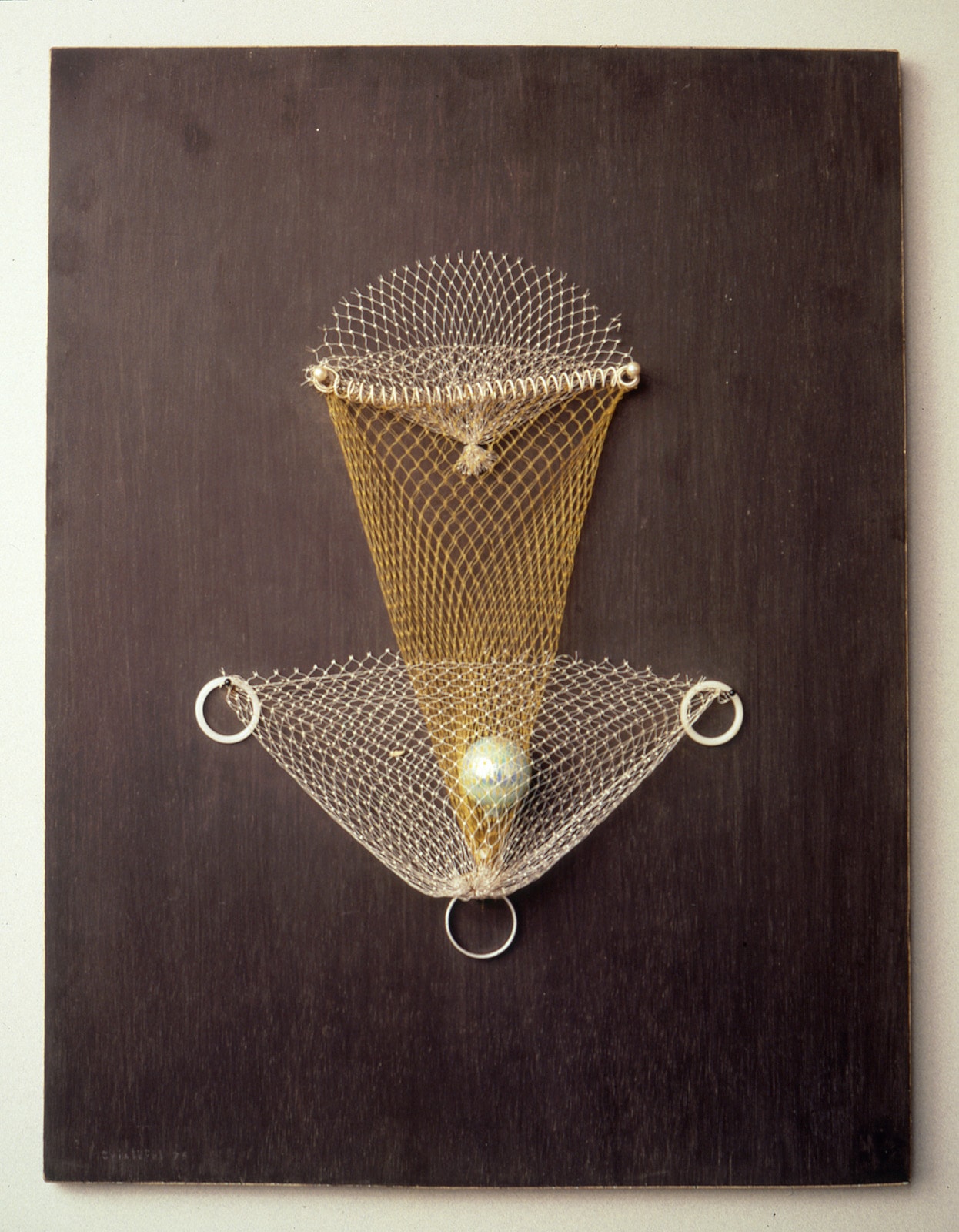 Xarxa i anellles de plàstic, bola de Nadal, agulles de cap i espiral sobre fusta tenyida