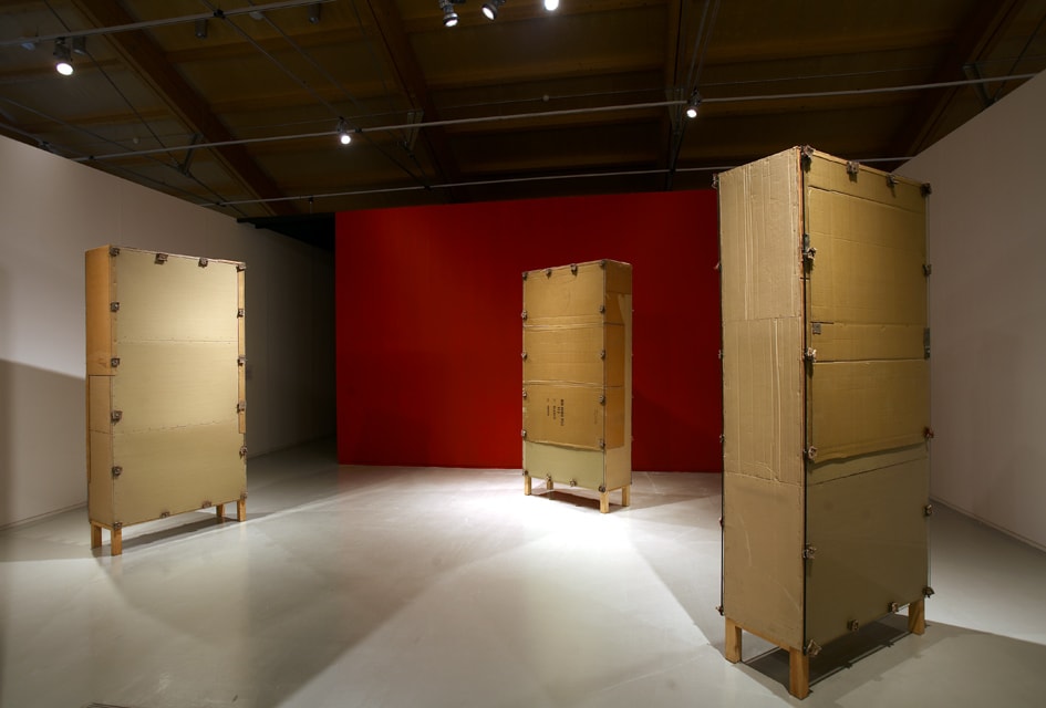 Instal·lació escultòrica de cartró, fusta, vidre i fragments d'estora
