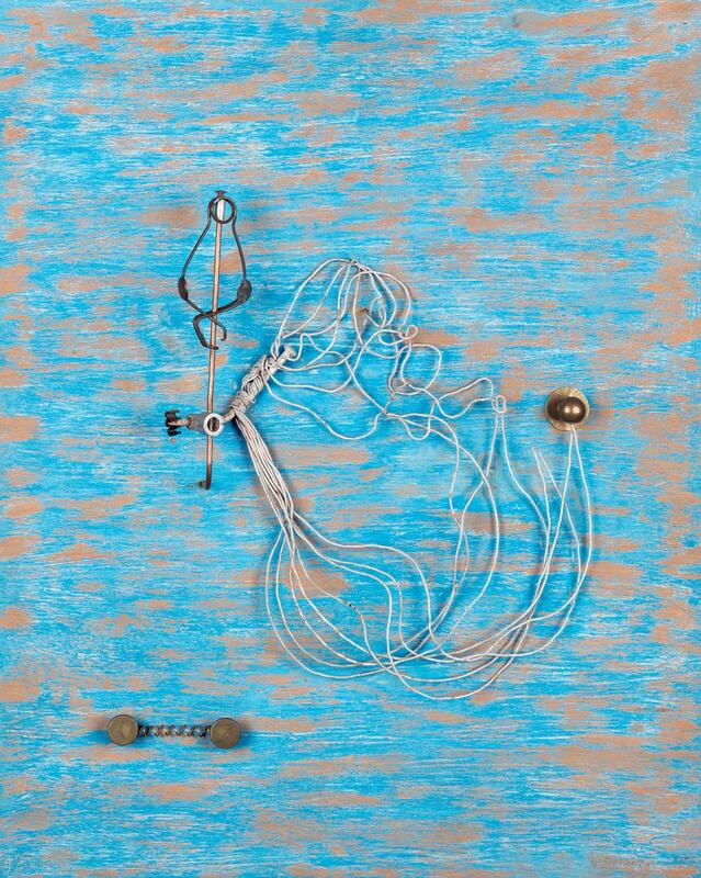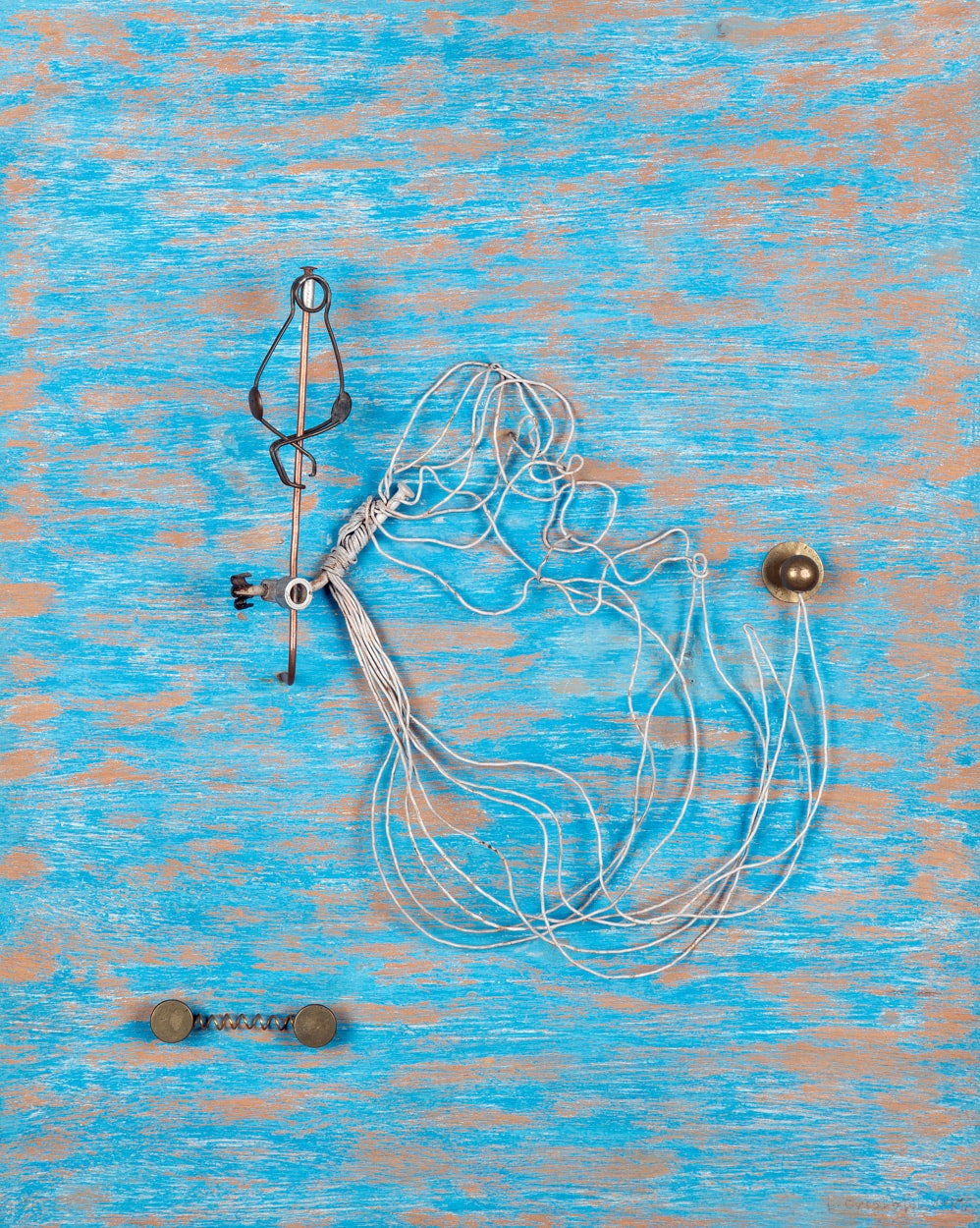 Filferro, fusta, acer, metall i plàstic sobre una fullola pintada