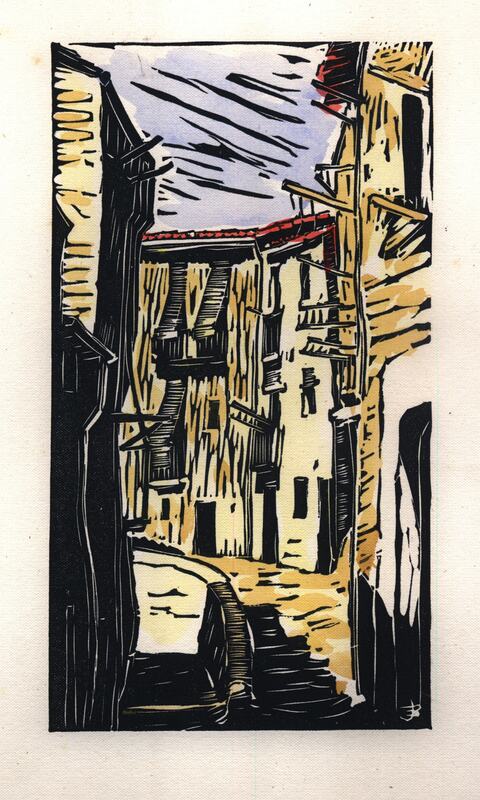 Josep Benseny és una figura clau en la represa cultural a la Lleida de postguerra. Artista polifacètic, en el camp del gravat destaca la seva sèrie sobre el Canyeret, un conjunt de linòleums on representa diferents racons d’aquest barri lleidatà. Benseny aprofita les línies pròpies de la tècnica del linòleum per acentuar la sensació de desolació i dramatisme dels carrerons estrets, en una edició il·luminada a mà pel propi artista que li atorga una categoria molt propera al còmic.
