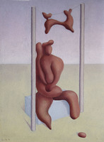 En el cas concret d’aquesta obra, que duu un títol força suggerent “Tubèrcul incúbic tot esperant l’hora seca”, manté aquesta estructura de la visió paisatgística de dos plans en el qual es dividit el quadre gairebé per la meitat, amb una part superior d’una irisació clara que ens remet a la llum diürna, que es veu reforçada per un primer pla de tons càlids que apunten al sentit horari del títol. La massa biomòrfica que situa en el centre adopta una actitud gairebé humana en resta asseguda en un cub i sota la protecció d’una mena de tendal, conformat per una altra forma biomorfa penjada. Tot plegat, resulta una visió d’una realitat desconcertant que apel•la a l’experiència d’allò meravellós dels somnis.