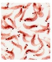 Frozen Fish Food #9 Frozen fish food és menjar congelat per peixos d’aquari. És el mateix que mengen els peixos que viuen lliures als mars, rius i llacs de la Terra: krill, artèmia, mysis, larves de mosquit blanques, vermelles o negres. Aqueta sèrie del 2001 semblen paper pintat estampat amb motius d’animals. Metafòricament Frozen Fish Food parla de nosaltres, els humans, que ens pensem lliures però és una il·lusió. Mengem congelats i encara coses pitjors, i estem tan atrapats com peixos en un aquari. Des de la pesca intensiva, l’abocament de tot tipus de residus i plàstics, el vessament de carburants i petroli, la mineria marina, l’augment de la temperatura de l’aigua fins a la catàstrofe nuclear de Fukushima que va provocar la més gran contaminació radioactiva marina de la història amb conseqüències irreversibles, les activitats humanes tenen un indiscutible impacte negatiu sobre la biodiversitat oceànica: n’alteren l’equilibri i n’amenacen la supervivència. Frozen Fish Food, i tots els altres treballs de la mateixa sèrie, són fotogrames. El fotograma interessa Aleydis Rispa perquè és un procés tècnic directe i simplificat. No cal càmera fotogràfica per obtenir les imatges sinó que aquestes sorgeixen pel simple dipòsit d’un objecte damunt d’un paper sensible exposat a la llum. Els objectes fotogramats deixen la seva empremta directament sobre l’emulsió fotosensible, paper o pel·lícula. Es tracta doncs de la mínima expressió de la fotografia, n’és l’essència.