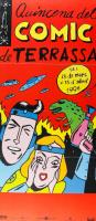 Cartell Quinzena del còmic de Terrassa Cartell per a la Quinzena del còmic de Terrassa, realitzadad del 23 de març al 13 d'abril de 1996. Apareixen dos superherois, ella amb un assecador de pèl i de fons 4 ovni's, un dinosaure així com un avió que cau, amb la informació de l'esdeveniment, part en bafarada, i un logotip amb un coet.