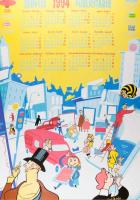 Calendari empresa gràfica Marc Martí Calendari per a l'empresa gràfica Marc Martí, amb els mesos a la part superior i al voltant logotips amb adreces del negoci i a la part inferior la vista d'un carrer urbà amb diferents personatges com un treballador de Marc Martí en furgoneta, un home-anunci de Marc Martí, així com un guàrdia urbà, nens, una senyora amb canitx, un presidiari sobre un teulat o dos senyors amb monòcul mirant uns quadres buits (al primer pla).