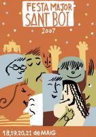 Cartell Festa Major Sant Boi Cartell per a la Festa Major de Sant Boi de Llobregat, entre el 18 i 21 de maig de 2007, amb 8 personatges juxtaposats en dues línies un dimoni al fons, així com un castell o construcció a la part esquerra, amb un fons de bombolles de colors i el text de la informació de l'esdeveniment.