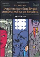 Cartell del llibre Donde nunca te han llevado cuando anochece en Barcelona Cartell del llibre escrit per Margarita Puig i il·lustrat per Gallardo, Donde nunca te han llevado cuando anochece en Barcelona. Apareixen 3 vinyetes: una noia amb un fons de dissenys geomètrics; un noi i una noia somrients; un noi amb camisa de ratlles de colors amb corbata i ulleres.