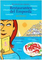 Cartell del llibre Restaurantes del Empordà Cartell del llibre escrit per Joan Matamala i il·lustrat per Gallardo, Restaurantes del Empordà. Apareix una senyora llegint una carta de restaurant amb un fons de mar i un poble de cases blanques així com una safata amb gambes i cloïsses.